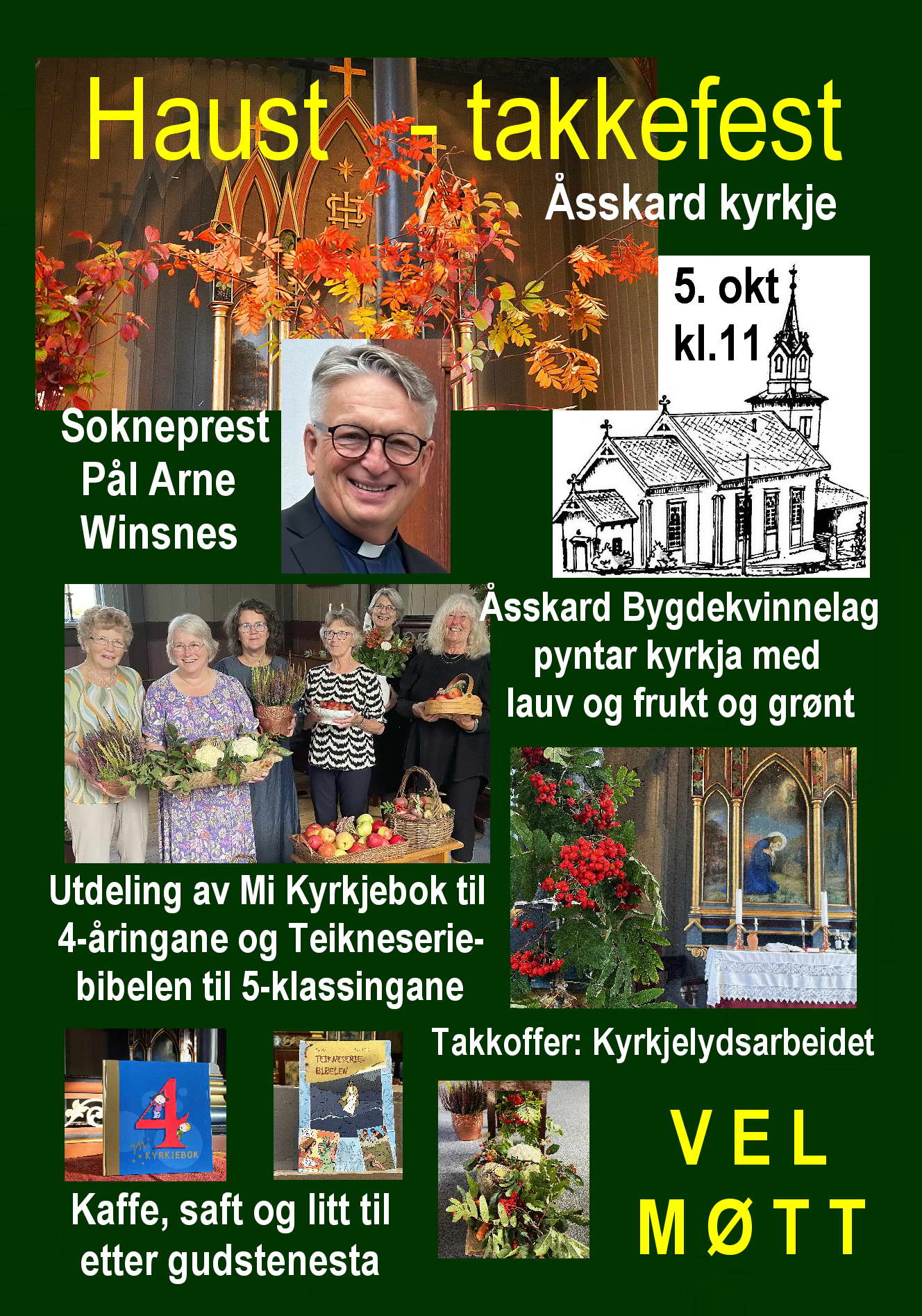 Åsskard Bygdekvinnelag ordnar som vanleg med haustpynt, frukt og grønt. Sokneprest Pål Arne Winsnes og hans stab leier messa - etter ordninga «Gudsteneste for små og store».