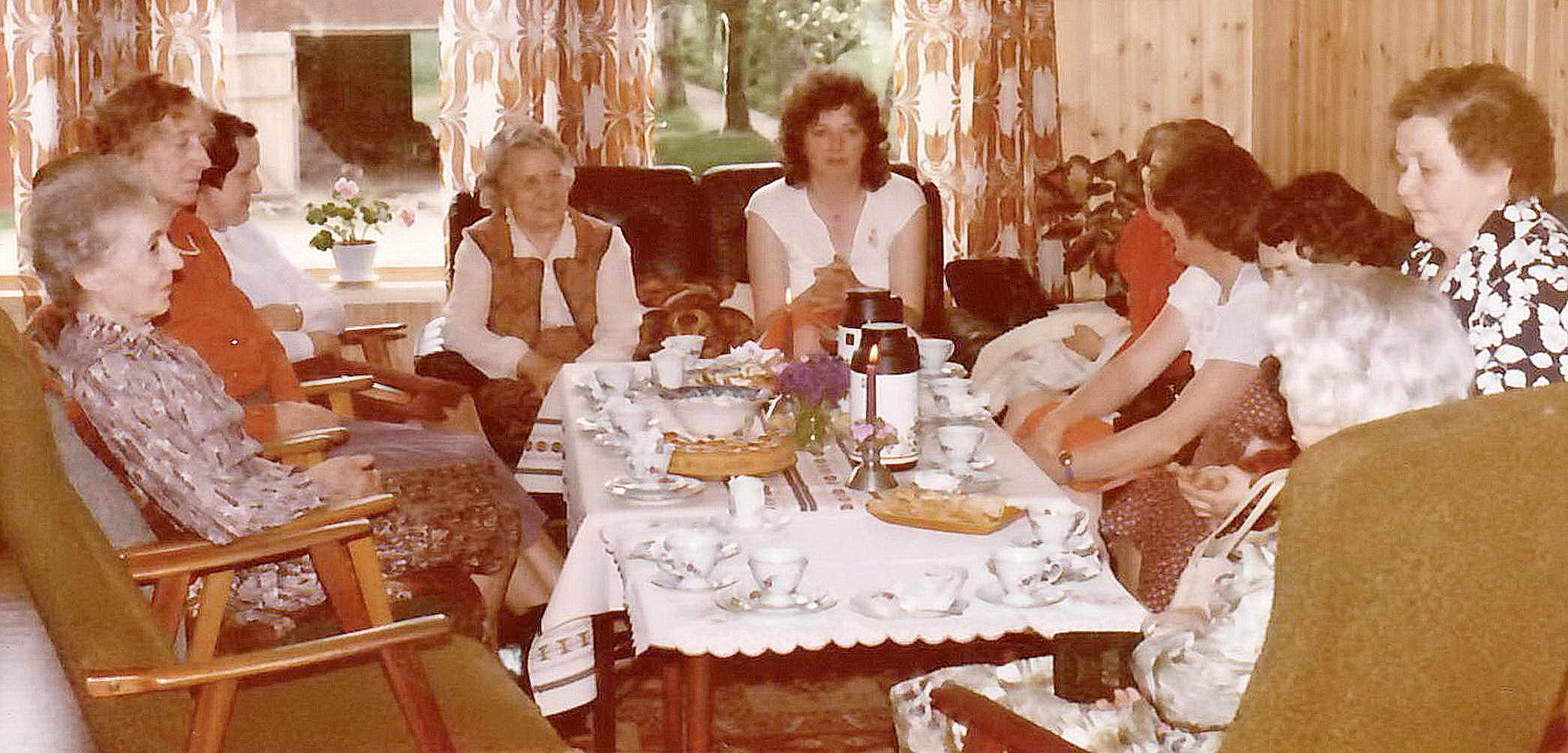 Møte i Hamnesfjordens Sjømanns(misjons)foreninng 8. juni 1983. Rundt bordet ser vi, meir eller mindre tydeleg, frå venstre: Marit Snekvik, Guri Snekvik, Edel Botten, Aslaug Aasgård, Astrid Garthe, Agnes Snekvik, Berit Sollid, Margit Snekvik og Magna Sollid. Nærast til høgre ei ukjend. Foto Kjellaug Sollid