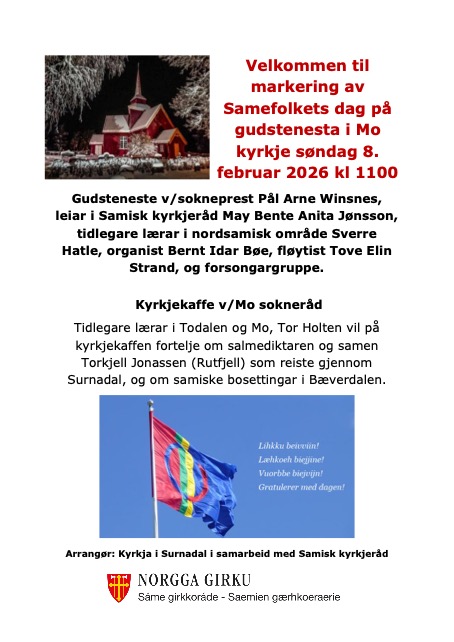 Kyrkja i Surnadal inviterer markering av Samefolkets dag 8. februar kl. 11:00 under gudstenesta i Mo kyrkje.