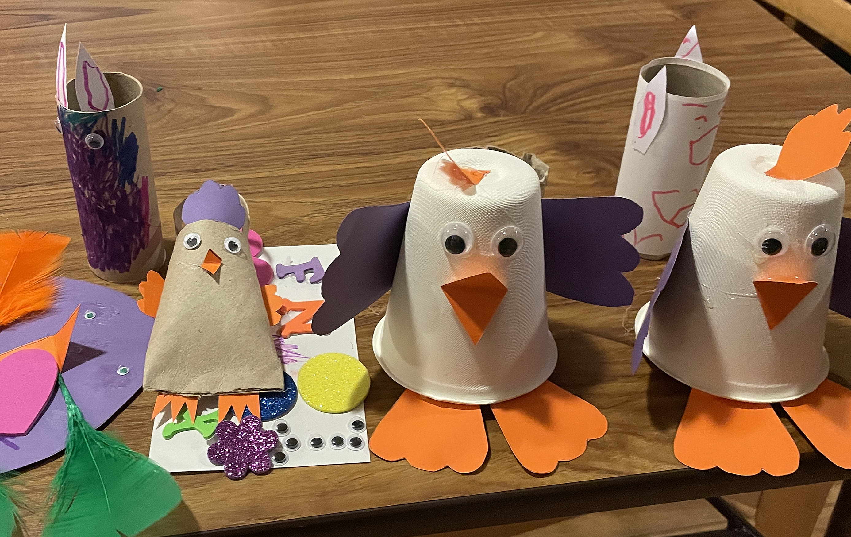 Enkle materialar av dorullar, pappbeger og anna vart til fine, ja – smilande - påskefigurar. Foto Randi Bøe